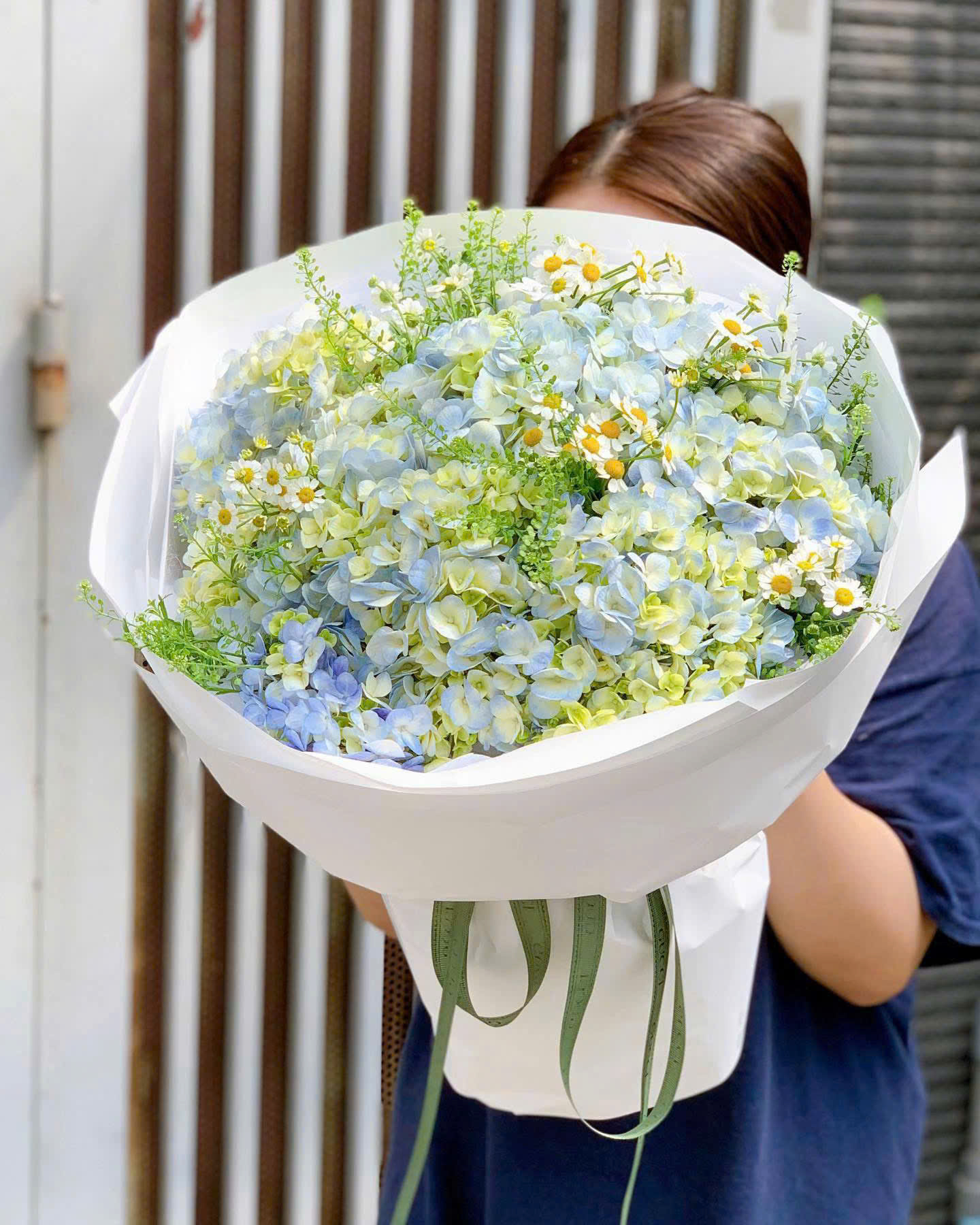 • Thành Phần Tinh Tế: Bó hoa được tạo nên từ 6 đến 7 bông Cẩm Tú Cầu 💙 – loài hoa tượng trưng cho lòng biết ơn và sự chân thành. Sự kết hợp này mang đến một khối hoa đầy đặn, bồng bềnh như mây: