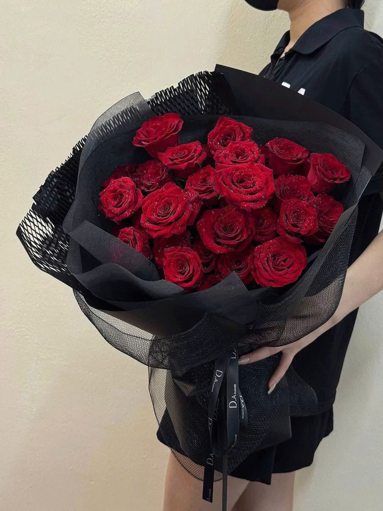 - Thiết Kế Bí Ẩn: Bó hoa được thiết kế với khoảng 30 đến 35 bông hồng 💐, tạo nên một tổng thể đầy đặn và choáng ngợp. Sự kết hợp giữa sắc đỏ nồng cháy của hoa và giấy gói màu đen tuyền mang lại cảm giác bí ẩn, cuốn hút và vô cùng sang trọng, khẳng định gu thẩm mỹ tinh tế của người tặng. 🖤