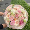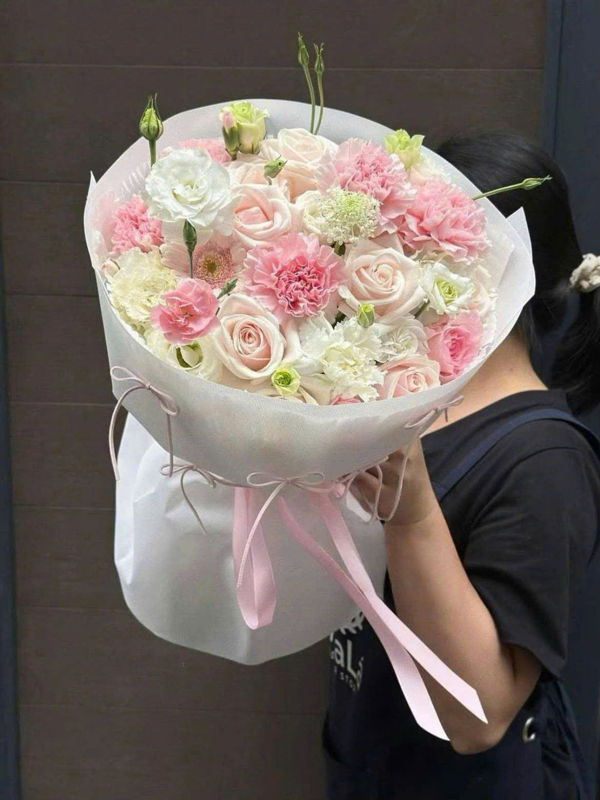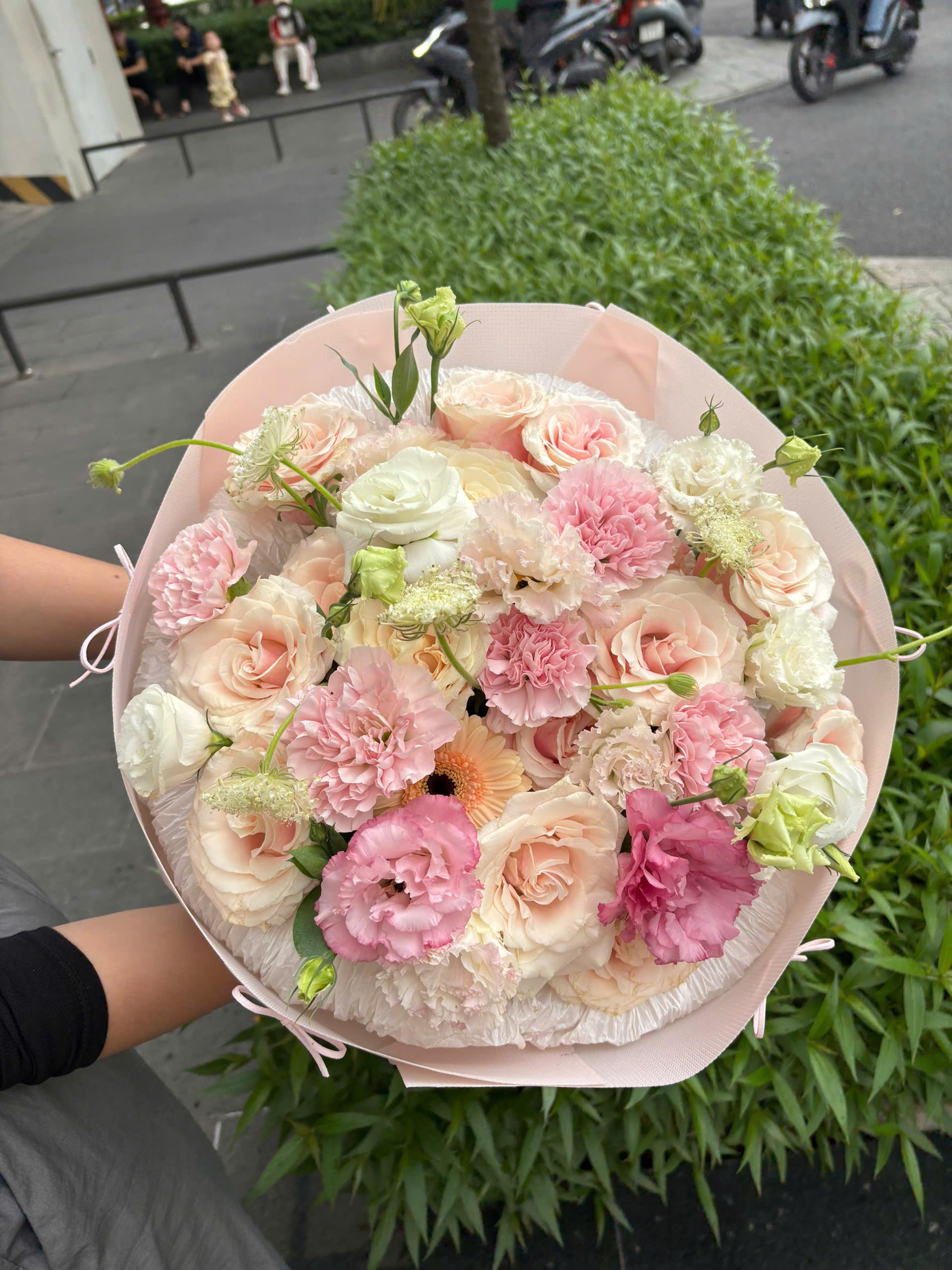 • Thành Phần Hài Hòa: Bó hoa là sự kết hợp tinh tế của nhiều loại hoa cao cấp, tạo nên bảng màu pastel thanh lịch: