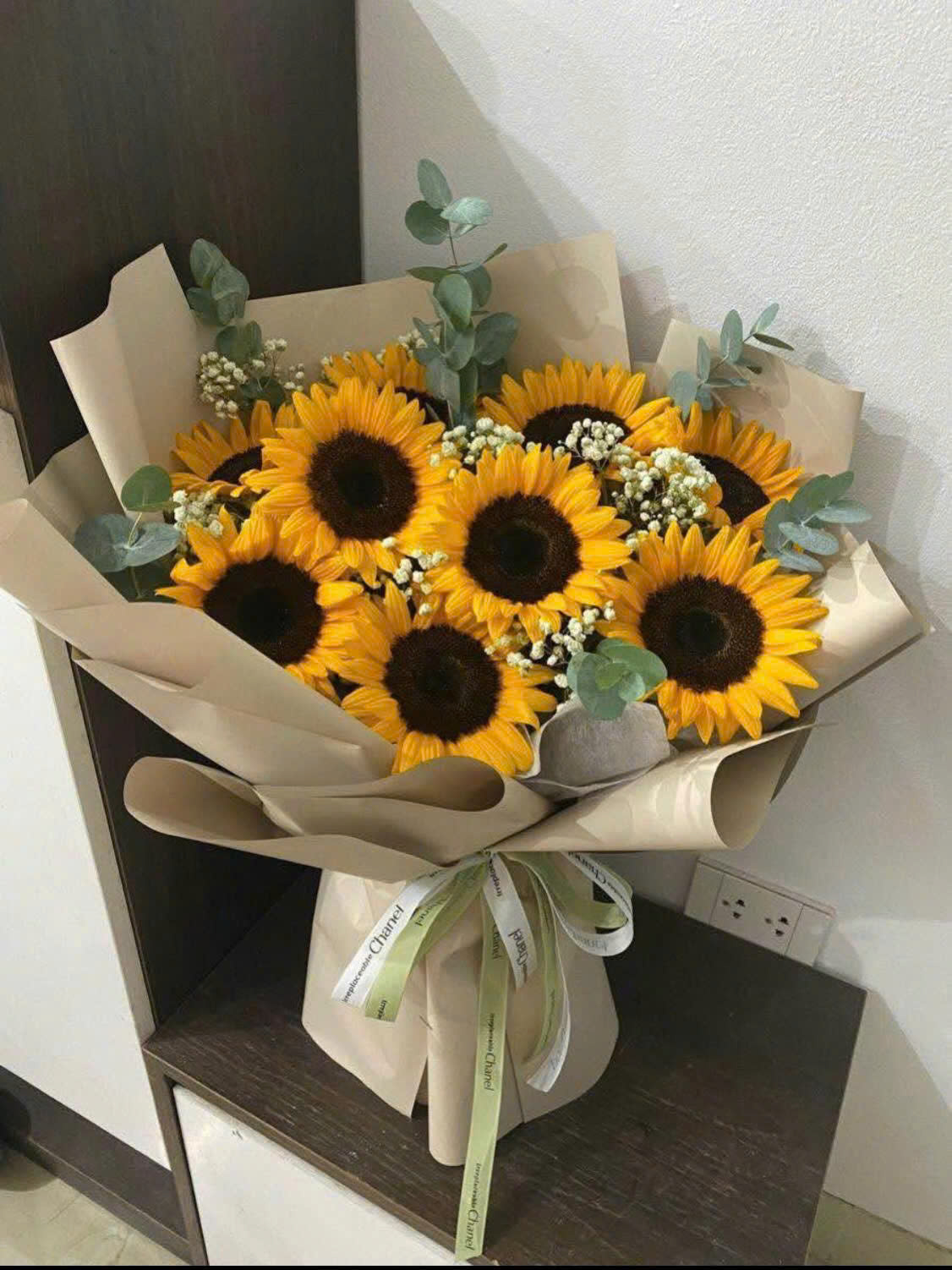- Kích Thước và Thành Phần: Bó hoa được kết từ khoảng 9 đến 10 bông Hướng Dương 🌻 chất lượng cao, tạo nên một tổng thể tròn đầy và ấm áp.